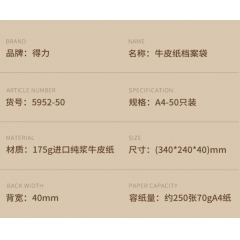 得力5952-50牛皮紙檔案袋175g(50個(gè)/包)