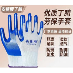 安捷順丁腈浸膠耐磨手套白紗藍膠