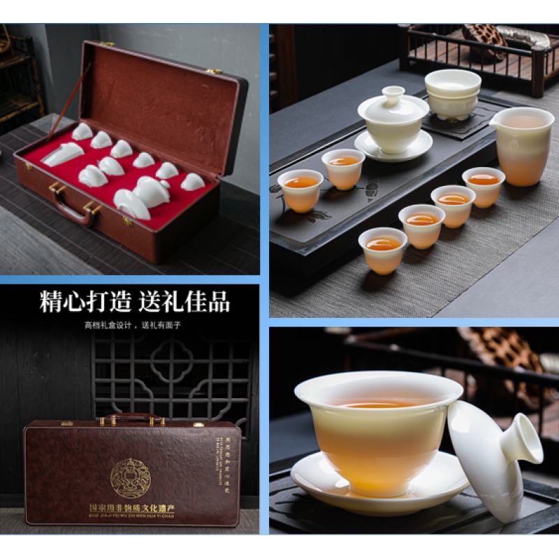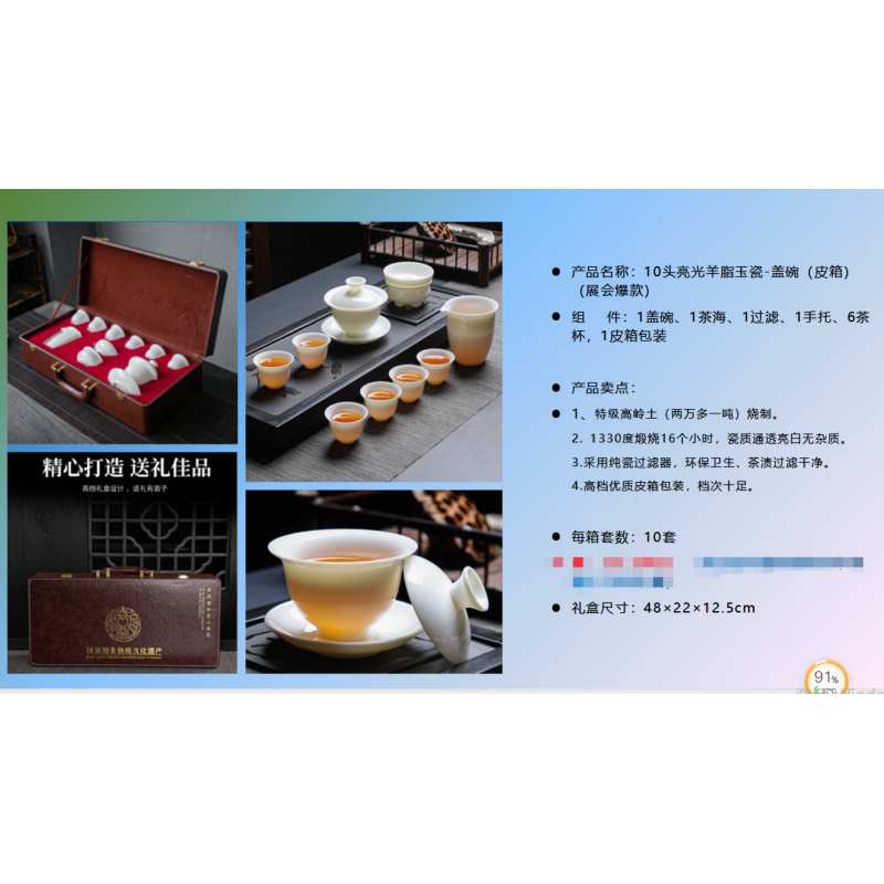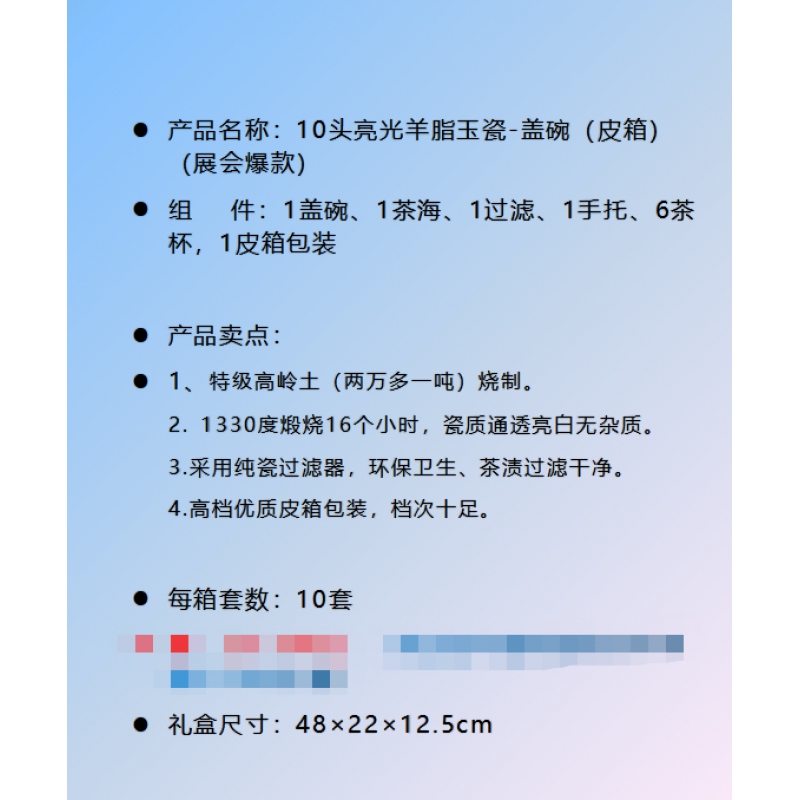 商品名稱:拓牌10頭亮光羊脂玉瓷-蓋碗(皮箱)