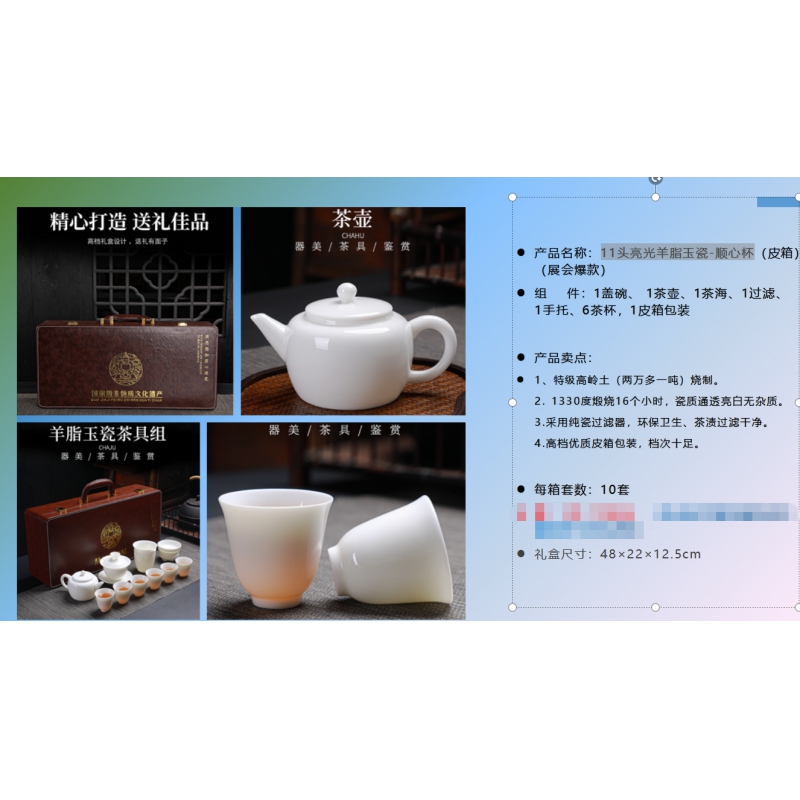 商品名稱:拓牌11頭亮光羊脂玉瓷-順心杯(皮箱)(展會(huì)爆款)