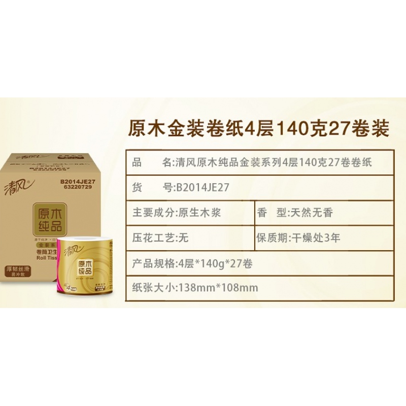 商品名稱:清風(fēng)B2014JE27原木純品金裝有芯卷紙?zhí)烊粺o香4層140g/卷