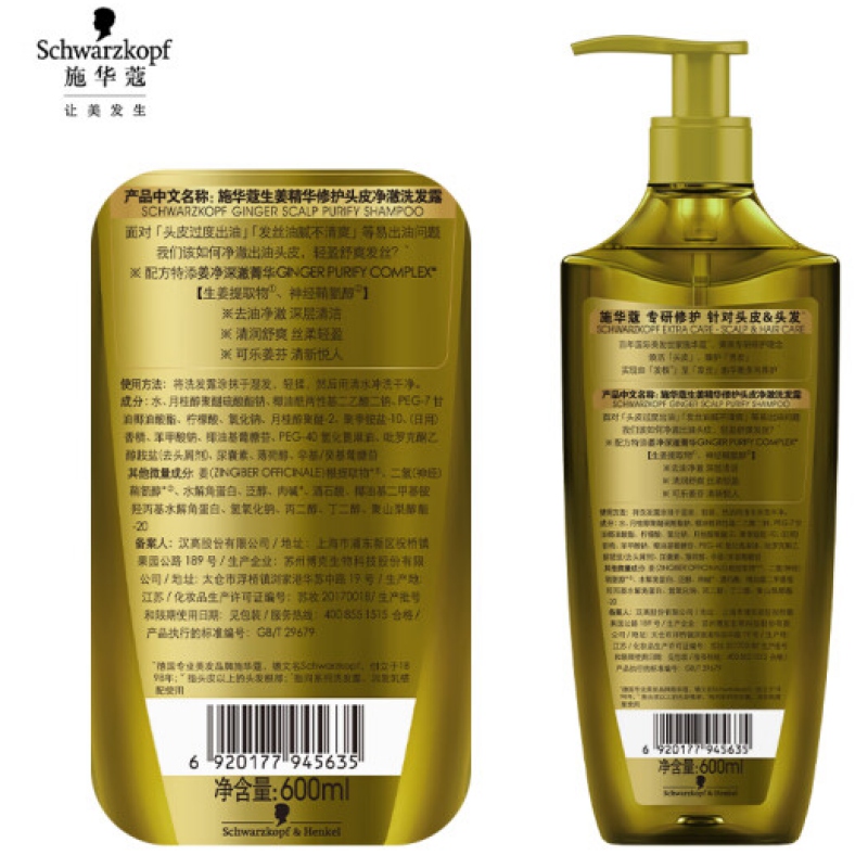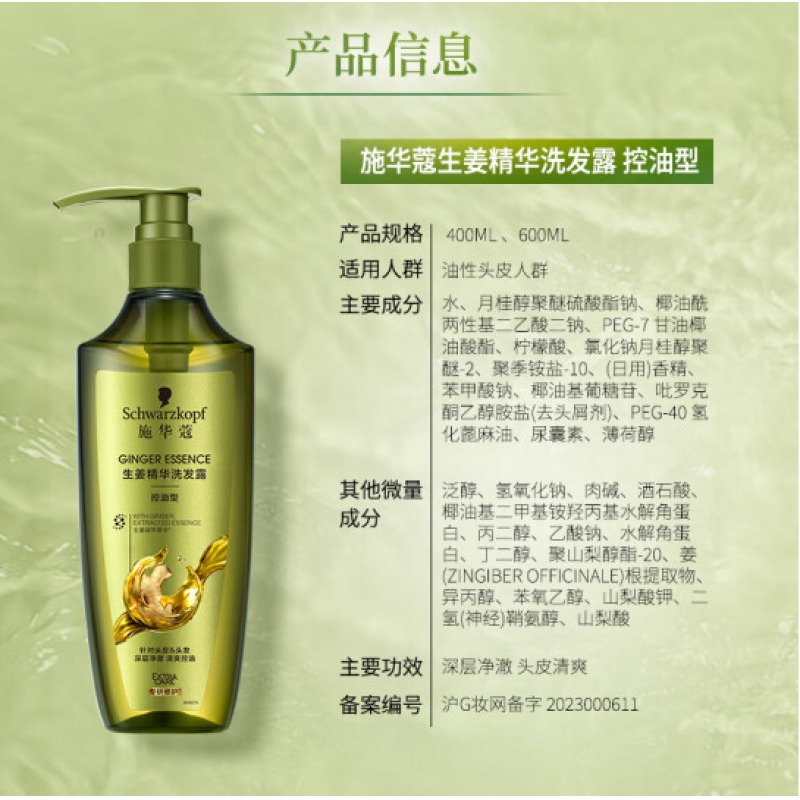 施華蔻生姜精華修護(hù)頭皮凈澈洗發(fā)露600ml(蓬松控油去屑洗發(fā)水)