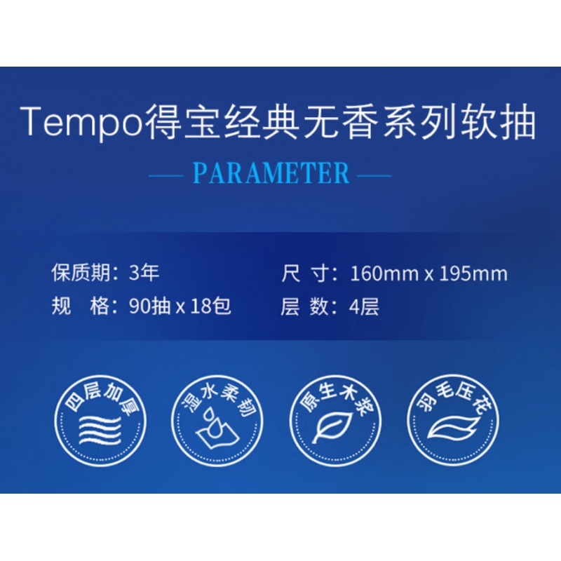 商品名稱:得寶T2275軟包抽紙經(jīng)典無香4層90抽160*195mm