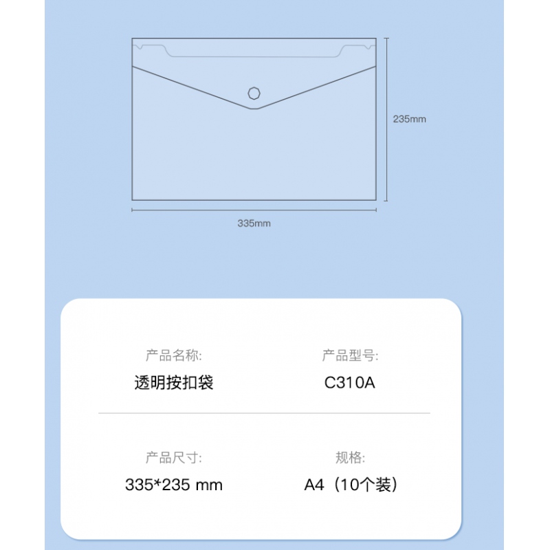 商品名稱:齊心C310A透明按扣袋A4(10個(gè)/包)